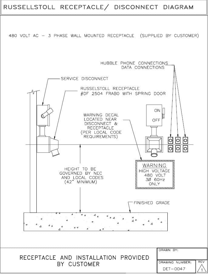 - RussellStoll Connector: It is recommended that the female RussellStoll connector be located no more than 40 feet from the trailer. This allows the 50-foot power cord to easily reach the onboard power supply. Proper placement of the connector ensures safe and efficient electrical connection.